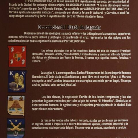 Por último, en el escudo se tiene una frase en latín: “Ad Augusta Per Angusta”, que significa “hacia lo más alto por lo más angosto”, una interpretación del avance y desarrollo de Irapuato en base a los esfuerzos de la gente.
