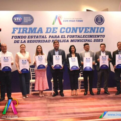 Irapuato, Gto. 26 de abril del 2023 .- Autoridades de nuevo municipios, incluido el Gobierno de Irapuato, firmaron junto a autoridades del Gobierno del Estado, el convenio del ‘Fondo Estatal para el Fortalecimiento de la Seguridad Pública Municipal’, con el cual refrendan su compromiso para mantener corporaciones fortalecidas al servicio de la ciudadanía.