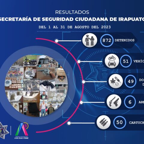 Irapuato, Gto. 06 de septiembre del 2023 .- Mediante acciones de prevención y dispositivos de control provisional, la Secretaría de Seguridad Ciudadana en coordinación con la Secretaría de la Defensa Nacional (Sedena) y la Guardia Nacional, detectaron y aseguraron durante agosto, seis armas de fuego, droga, entre otros objetos, con lo que se logró inhibir posibles delitos y eliminar fuentes de peligro para la población.