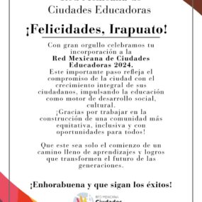 Ahora que Irapuato cuenta por primera vez con el certificado que le avala como una de las 18 ciudades mexicanas que se encuentran dentro de la AICE, podrá participar en noviembre en el Encuentro Nacional de Ciudades Educadoras, donde se expondrán las buenas prácticas que se llevan a cabo; además, el próximo año, formará parte de la cumbre internacional para intercambiar ideas y proyectos con ciudades de otras partes del mundo.