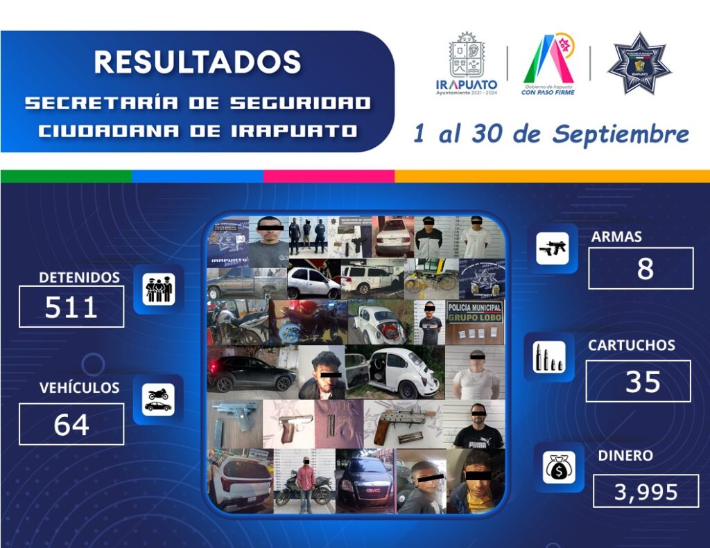 Irapuato, Gto. 01 de octubre del 2024 .- La Secretaría de Seguridad Ciudadana Municipal reportó durante el mes de septiembre 511 personas detenidas por la comisión de faltas cívicas y delitos.