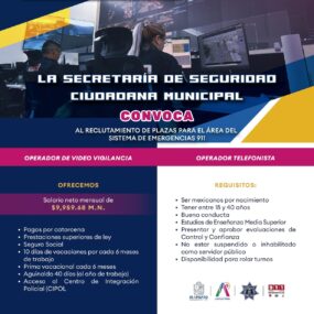 Irapuato, Gto. 08 de octubre del 2024 .- La Secretaría de Seguridad Ciudadana se fortalece, el Gobierno Municipal de Irapuato encabezado por la presidenta Lorena Alfaro García, mantiene abierta la convocatoria para las plazas de Operador de Video Vigilancia y Operador Telefonista del Sistema de Emergencias 9-1-1.