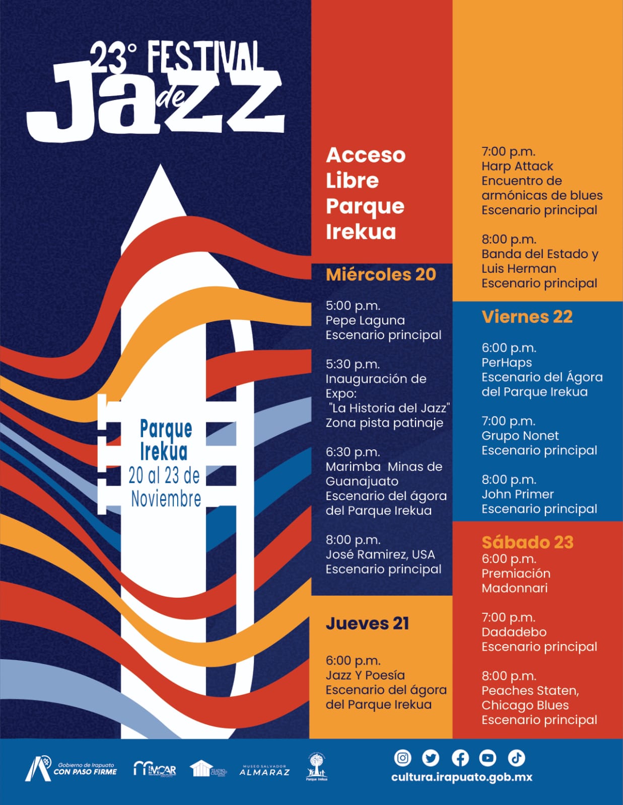 Del 20 al 23 de noviembre el Parque Irekua, será sede de la 23 edición del Festival de Jazz, la entrada será libre para que las familias puedan disfrutar de amplia variedad de músicos que se presentarán, a la par, se realizarán las actividades del festival Madonnari en el mismo recinto, en donde artistas plasmarán obras de arte en el suelo.