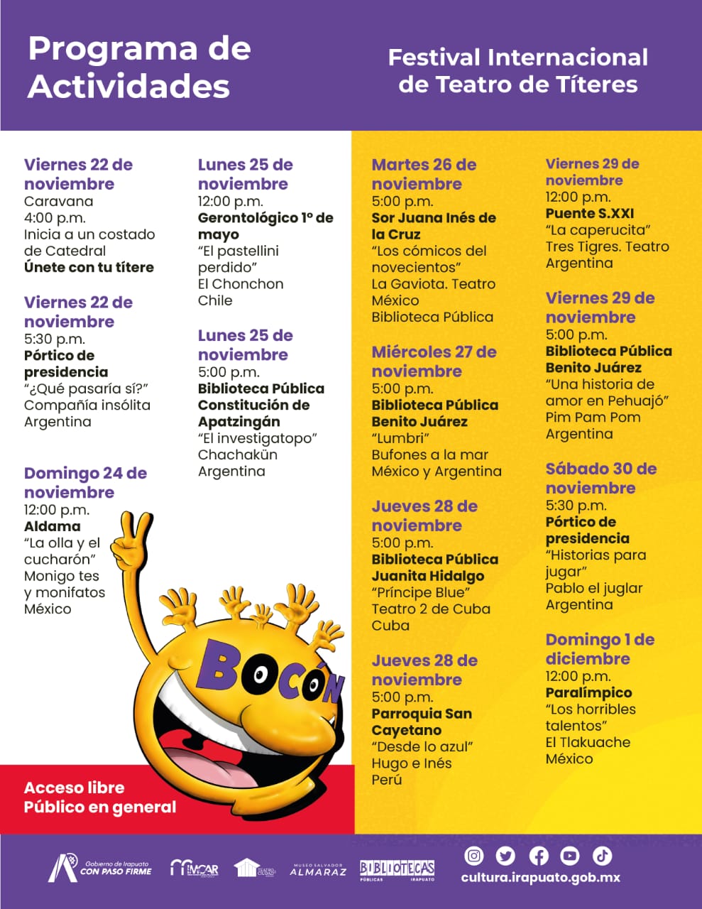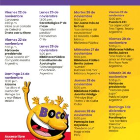 El viernes 22 de noviembre iniciará la segunda edición del Festival Internacional de Títeres Bocón, que participará con firugas de todo el mundo hasta el 01 de diciembre, en esta ocasión el país invitado será Argentina. Las presentaciones se llevarán a bibliotecas, colonias y comunidades para el disfrute de todos.