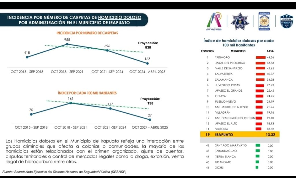 La evidencia en Irapuato indica que el trabajo coordinado sí funciona: hubo una disminución de 81.44 a 13.32 homicidios dolosos por cada 100 000 habitantes entre 2018 y abril de 2025, lo que hoy nos coloca en la posición 19 del estado.