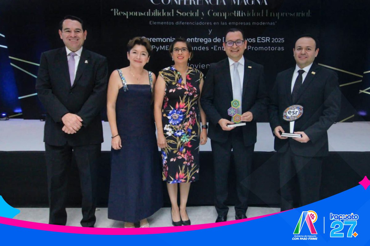 Irapuato, Gto. 22 de noviembre del 2025 .- Para reconocer a las empresas que trabajan por el bienestar social, se entregó el Distintivo ESR®️ (Empresa Socialmente Responsable) a 180 compañías provenientes de distintos municipios de Guanajuato, Michoacán y Aguascalientes, como muestra de su compromiso con prácticas éticas, sostenibles y orientadas al bienestar de sus colaboradores y comunidades.